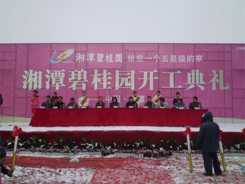 | 大雪紛飛、覆蓋四野,2011年1月20日,頂著嚴(yán)寒,頂著鵝毛大雪,湘潭碧桂園開工典禮儀式在湘潭天易示范區(qū)金霞山風(fēng)景區(qū)旁湘潭碧桂園項目現(xiàn)場隆重舉行,湘潭各級領(lǐng)導(dǎo)與碧桂園集團負(fù)責(zé)人歡聚一堂,喜迎湘潭碧桂園開工典禮。 |
