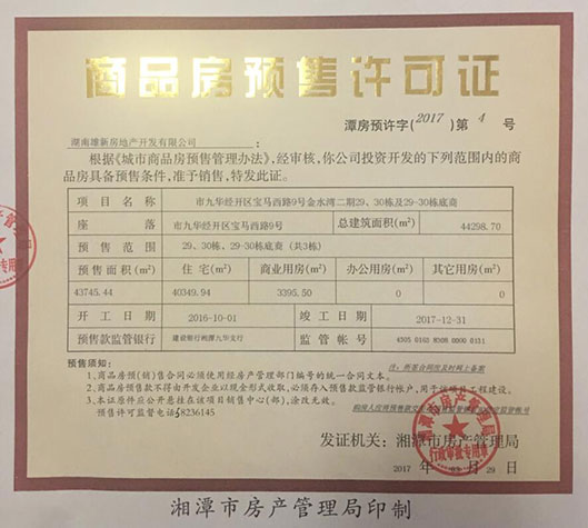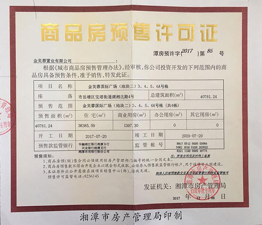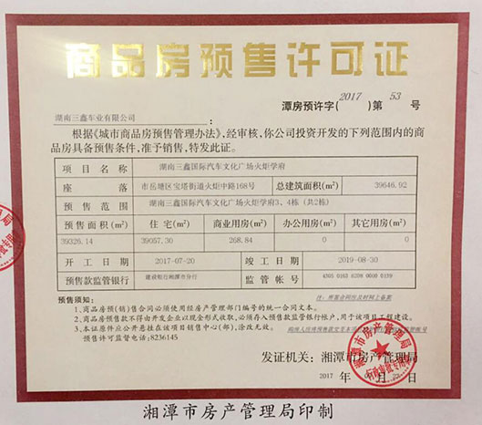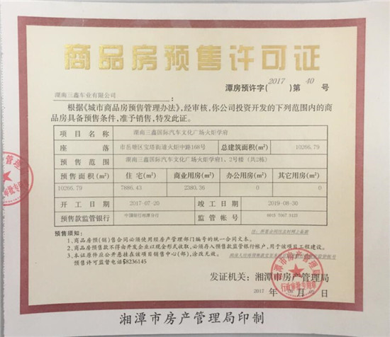 湖南三鑫國(guó)際汽車文化廣場(chǎng)火炬學(xué)府3、4號(hào)樓(共2棟)預(yù)售許可證