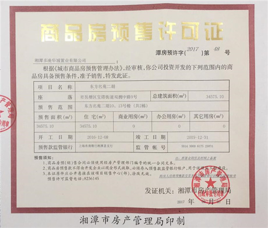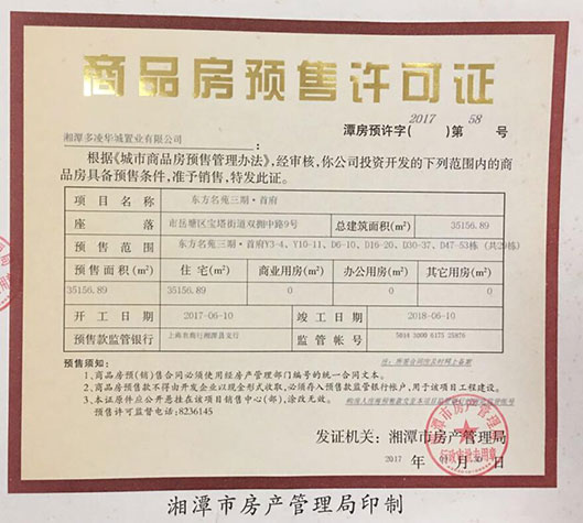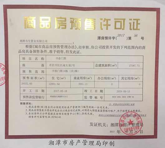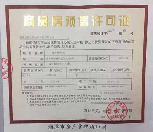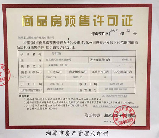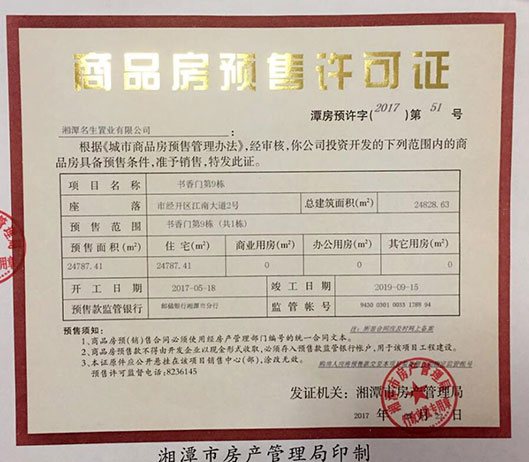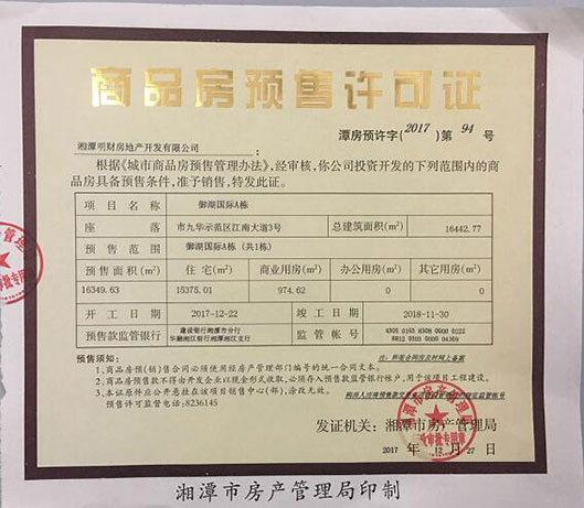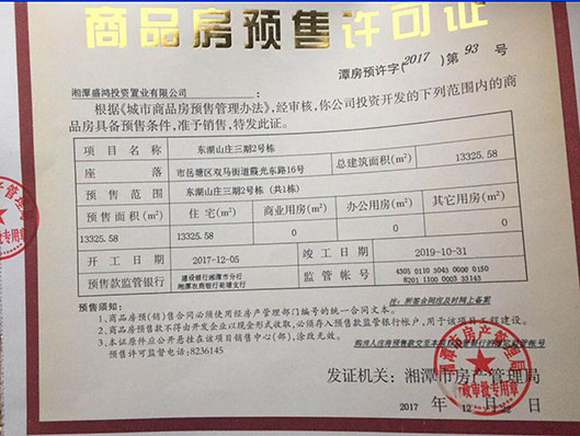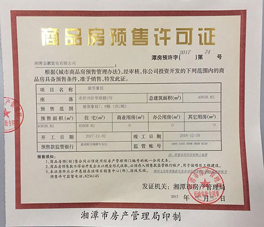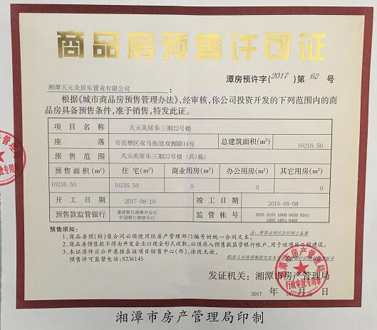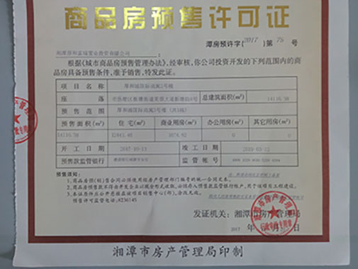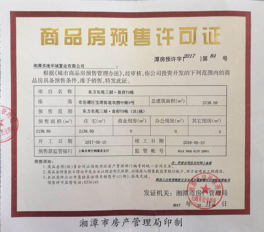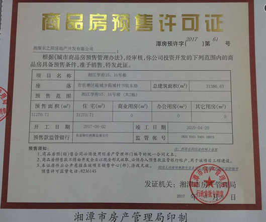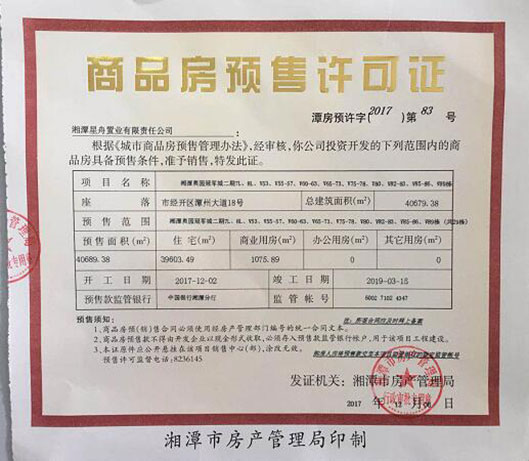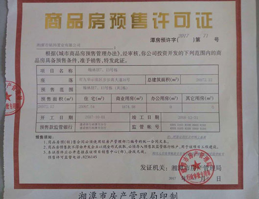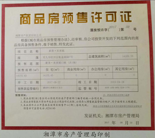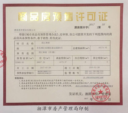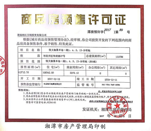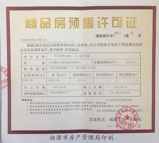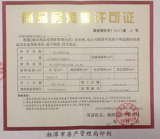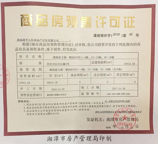 湖南富力城一期西區(qū)F區(qū)5-12、25-29、39-47棟(共22棟)的預(yù)售許可證