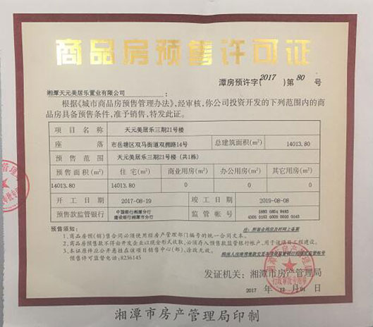 天元美居樂(lè)三期21號(hào)樓(共1棟)預(yù)售許可證