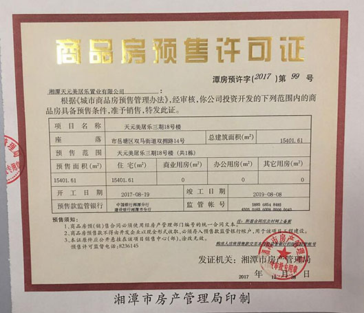 天元美居樂(lè)三期18號(hào)樓(共1棟)預(yù)售許可證
