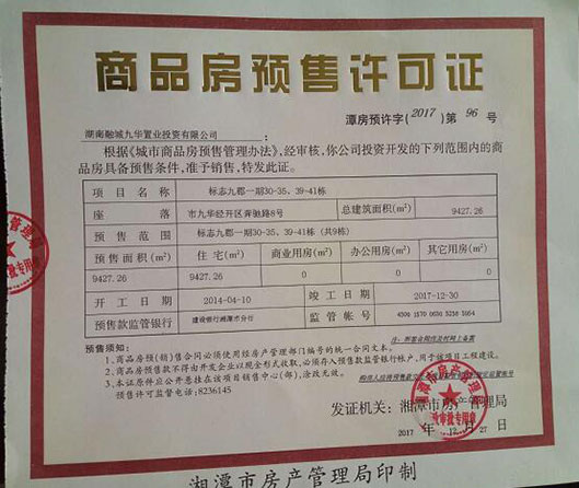 16 標(biāo)志九郡一期30-35、39-41棟(共9棟)預(yù)售許可證