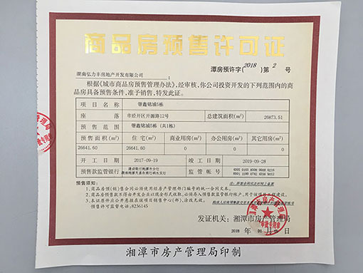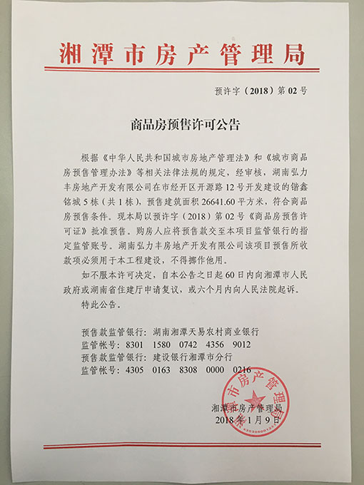 經(jīng)審核,湖南弘力豐房地產(chǎn)開發(fā)有限公司在市經(jīng)開區(qū)開源路12號(hào)開發(fā)建設(shè)的鍇鑫銘城5棟(共1棟),預(yù)售建筑面積26641.60平方米,符合商品房預(yù)售條件。現(xiàn)湘潭市房產(chǎn)局以預(yù)許字(2018)第02號(hào)《商品房預(yù)售許可證》批準(zhǔn)預(yù)售。
