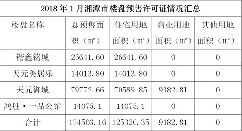 根據(jù)小編不完全統(tǒng)計,2018年1月份湘潭市共計有4個樓盤成功取得了樓盤預售許可證,共計批準預售面積134503.16㎡,其中,住宅用地共計批準預售125320.35㎡,商業(yè)用地共計批準預售9182.81㎡,具體預售情況如下表: