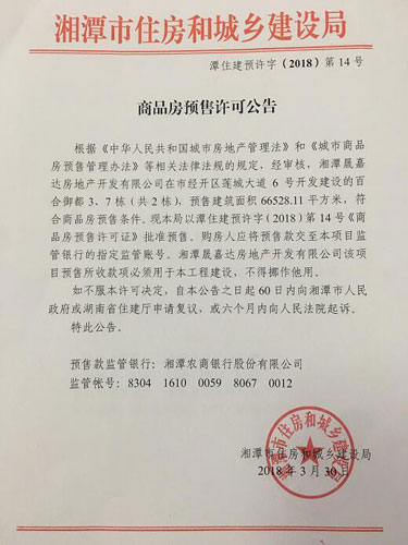 經(jīng)審核,湘潭晟嘉達(dá)房地產(chǎn)開發(fā)有限公司在市經(jīng)開區(qū)蓮城大道6號開發(fā)建設(shè)的百合御都3、7棟(共2棟),預(yù)售建筑面積66528.11平方米,符合商品房預(yù)售條件,F(xiàn)湘潭市住房和城鄉(xiāng)建設(shè)局以潭住建預(yù)許字(2018)第14號《商品房預(yù)售許可證》批準(zhǔn)預(yù)售。