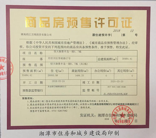恒大御景半島一期6、7棟(共2棟)預(yù)售許可證