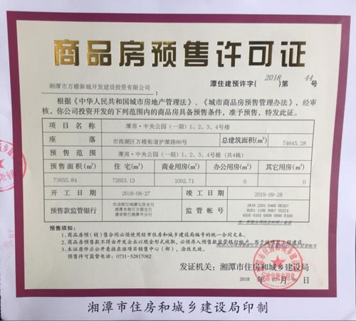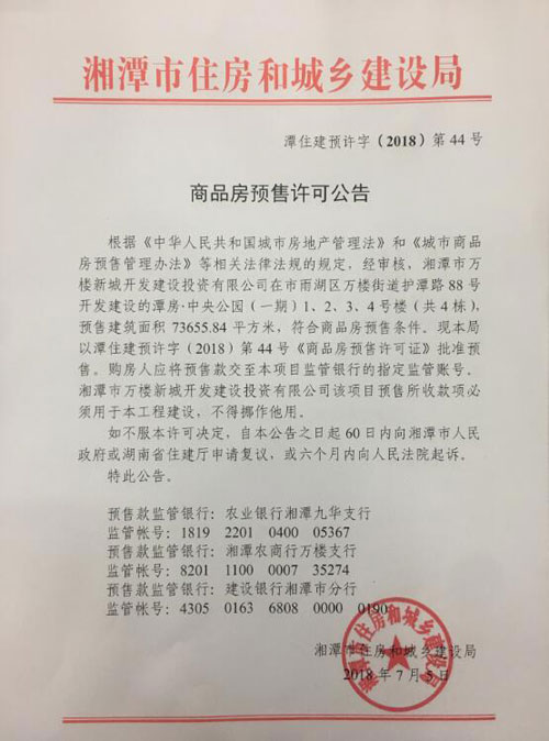 經(jīng)審核,湘潭市萬樓新城開發(fā)建設(shè)投資有限公司在市雨湖區(qū)琬樓街道護(hù)潭路88號開發(fā)建設(shè)的潭房·中央公園(一期)1、2、3、4號樓(共4棟)預(yù)售建筑面積73655.84平方米,符合商品房預(yù)售條件,現(xiàn)湘潭市住建局以潭住建預(yù)許字(2018)第44號《商品房預(yù)售許可證》批準(zhǔn)預(yù)售。