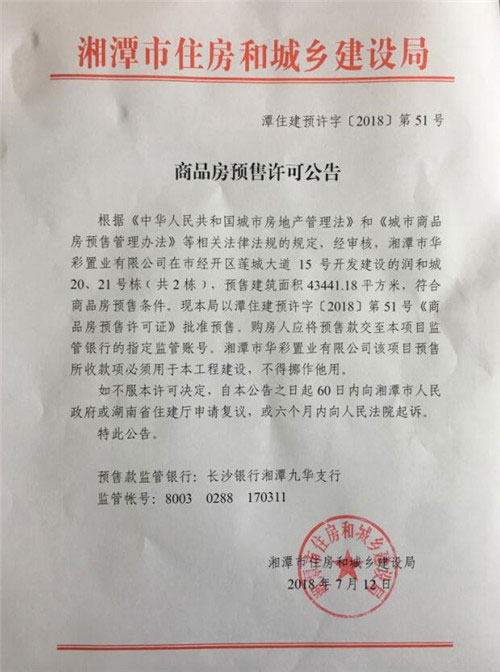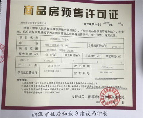 經(jīng)審核,湘潭市華彩置業(yè)有限公司在市經(jīng)開區(qū)蓮城大道15號開發(fā)建設(shè)的潤和城20、21號棟(共2棟)預售建筑面積43441.18平方米,符合商品房預售條件,現(xiàn)湘潭市住建局以潭住建預許字(2018)第51號《商品房預售許可證》批準預售。