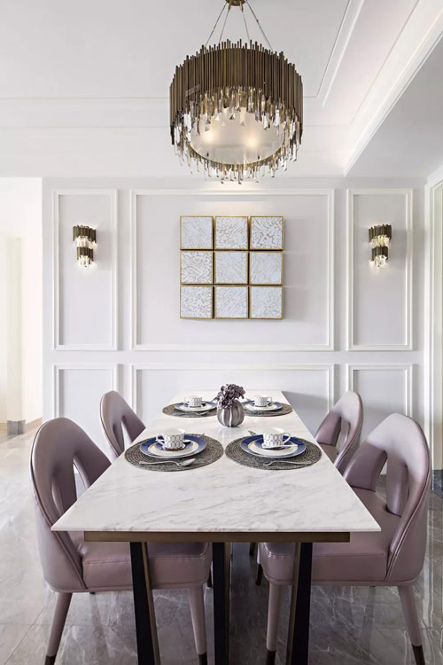 賦予節(jié)奏與美,給空間角色,帶情入景。延續(xù)客廳中點而睛的翅膀元素將其散落在餐廳中,唯美的紫色與曼妙的天使,演繹著一場夢。