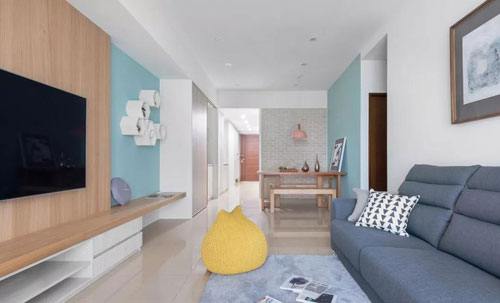 并擺放藍(lán)色沙發(fā),搭配木質(zhì)板材調(diào)平衡暖度,以多彩配色烘托舒適的居家風(fēng)貌,在或輕或重的筆觸之間,巧妙置入生活機(jī)能,串接每一道機(jī)能表情。