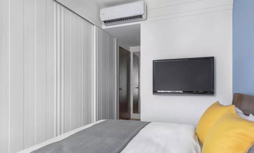 主臥室,延續(xù)清爽調(diào)性,鋪陳一室溫暖氛圍,透過收大梁的設(shè)計(jì),讓整體構(gòu)架更清爽工整,并依循收納需求打造一整排衣柜,佐以直線條的立體修飾,兼具美化視覺與拉高空間感的效果.