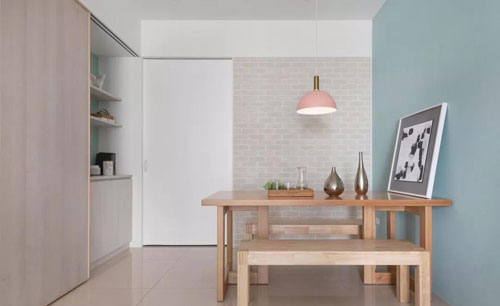 餐廚內(nèi)存塊,因考察到油煙散逸問題,另做拉門隔出廚房領(lǐng)域,并透過餐廳門片的設(shè)定,圍塑出獨(dú)立的用餐范圍,門片呈現(xiàn)凈白底調(diào),旁側(cè)銜接溫潤(rùn)的淺色文化石墻,讓門板融入整體設(shè)計(jì)。