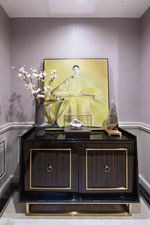 整體硬裝是英式風(fēng)格,主要體現(xiàn)在深色大理石板材和米黃色磚材,還有大量的高級灰木飾面來調(diào)和整體硬朗的材質(zhì)色彩。軟裝整體色調(diào)是以米色、黑色和灰色為主色調(diào),木色作為點(diǎn)綴色。