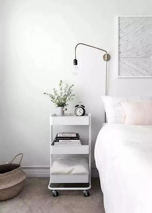 床頭不一定要放柜子,如果你是一個(gè)比較隨性的人,那么小推車完全可以代替?zhèn)鹘y(tǒng)意義上的床頭柜。它可以放置生活上或者辦公用的小物品,隨時(shí)移動(dòng),可以根據(jù)需求想放哪里放哪里,這就是能滾動(dòng)家具的精妙之處,而且還會(huì)讓空間更通透,相信你一定會(huì)愛上它。