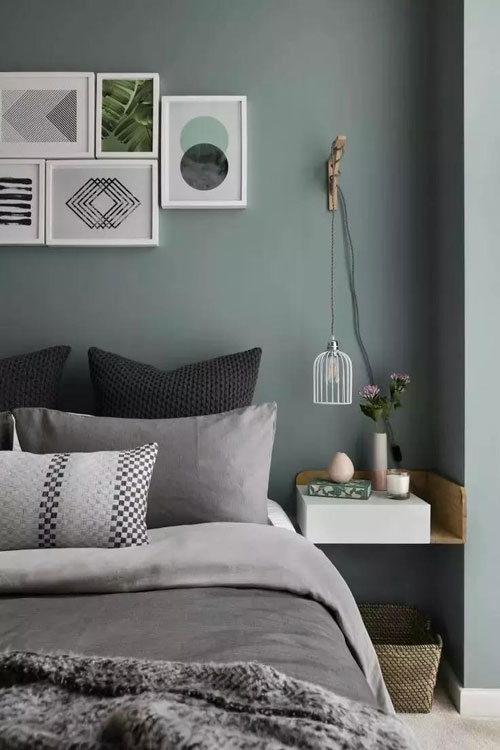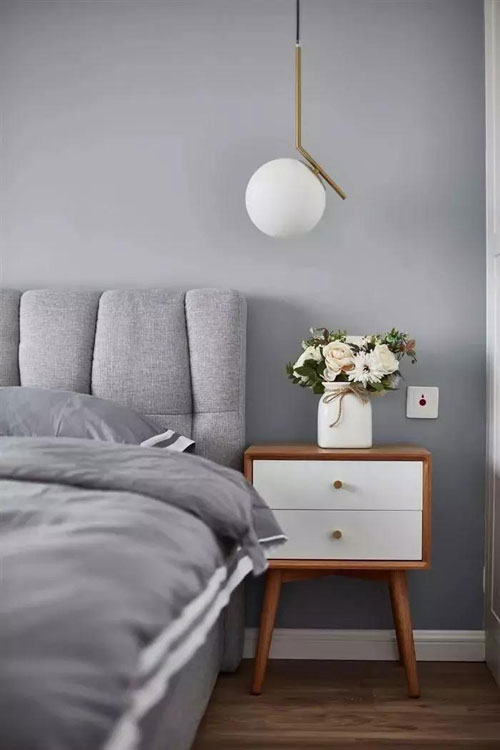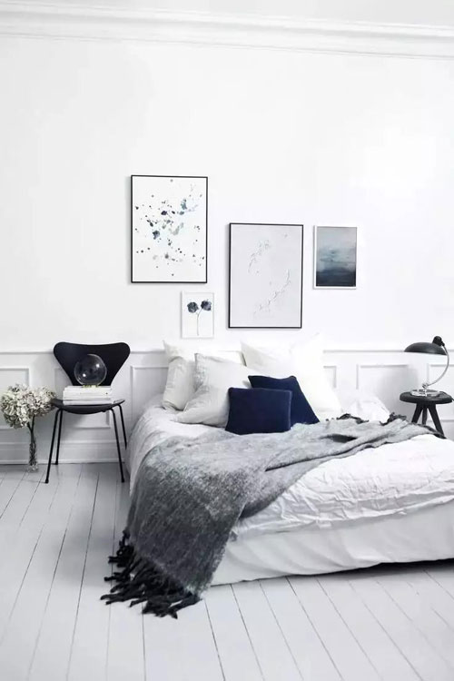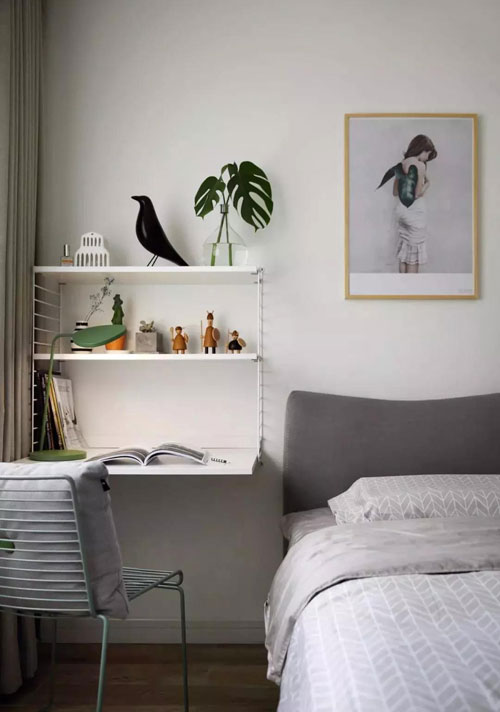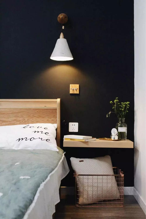 如果由于戶型的原因,放完床后,完全沒(méi)有床頭柜的位置,可以考慮讓這個(gè)收納設(shè)計(jì)上墻,因?yàn)椴恢挥械厣系拇差^柜才有收納功能,把床頭一邊或者兩邊的墻上設(shè)計(jì)一個(gè)能收納又能裝飾的置物架,或者置物框。比起普通的床頭柜,掛在墻上的小巧壁柜完全不占空間,剩余空間可以給其他家具。