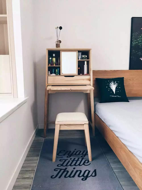 小茶幾、凳子、化妝臺(tái)也同樣適用于床頭。相對(duì)傳統(tǒng)的笨重床頭柜,這樣小巧輕盈的設(shè)計(jì),不占太多的空間,基本的收納完全沒(méi)問(wèn)題。