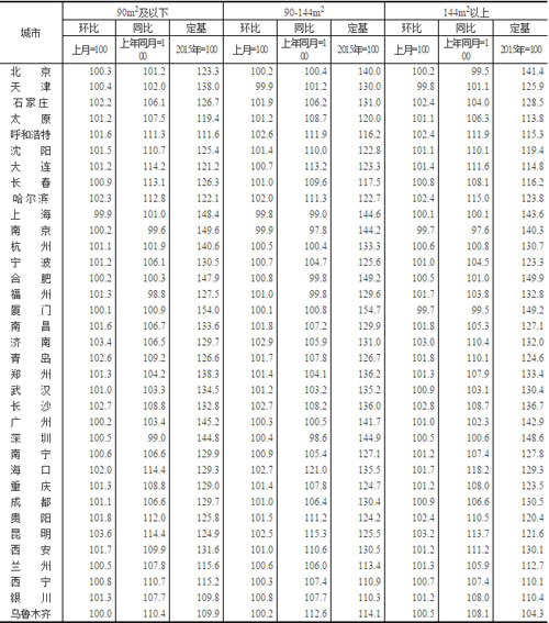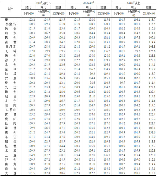 在7月份70個(gè)大中城市新建商品住宅銷售價(jià)格分類指數(shù)變動(dòng)情況中,在90㎡以下的面積區(qū)間中,三亞的新建商品住宅銷售價(jià)格環(huán)比上漲了4.9%,位列70城第一,三亞的新建商品住宅銷售價(jià)格同比上漲了17.2%,位列70城第一;在90-144㎡的面積區(qū)間中,三亞的新建商品住宅銷售價(jià)格環(huán)比上漲了3.4%,位列70城第一,海口的新建商品住宅銷售價(jià)格同比上漲了21%,位列70城第一;在144㎡以上的面積區(qū)間中,昆明的新建商品住宅銷售價(jià)格環(huán)比上漲了3.2%,位列70城第一,?诘男陆ㄉ唐纷≌N售價(jià)格同比上漲了18.2%,位列70城第一。
