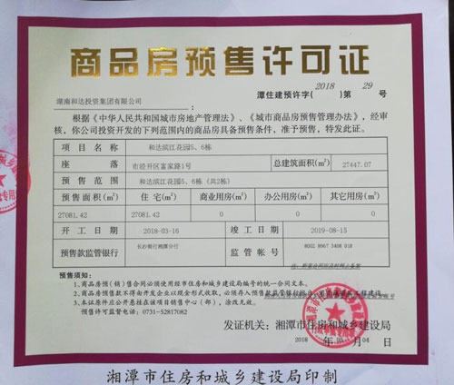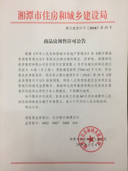 經(jīng)審核,湖南和達(dá)投資集團(tuán)有限公司在市經(jīng)開(kāi)區(qū)富家路1號(hào)開(kāi)發(fā)建設(shè)的和達(dá)濱江花園5、6棟(共2棟),預(yù)售建筑面積27081.42平方米,符合商品房預(yù)售條件,現(xiàn)湘潭市住建局以潭住建預(yù)許字(2018)第29號(hào)《商品房預(yù)售許可證》批準(zhǔn)預(yù)售。 |