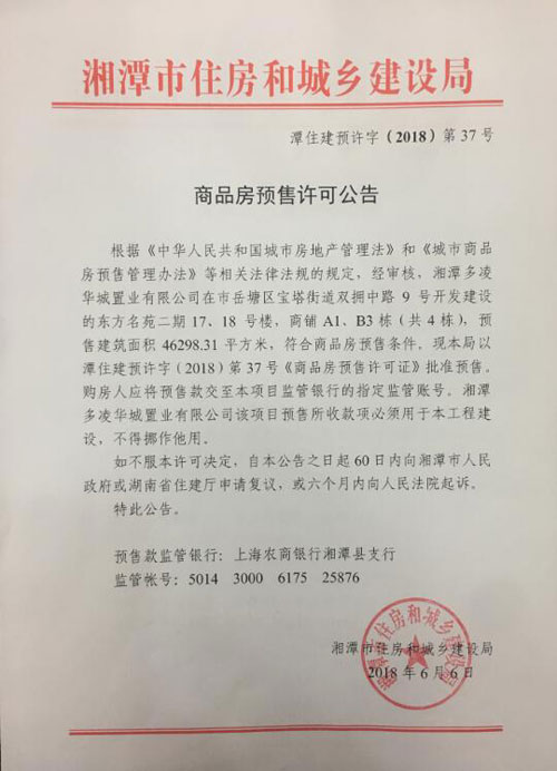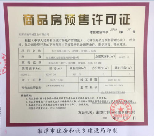 經(jīng)審核,湘潭多凌華城置業(yè)有限公司在市岳塘區(qū)寶塔街道雙擁中路9號(hào)開發(fā)建設(shè)的東方名苑二期17、18號(hào)樓,商鋪A1、B3棟(共4棟),預(yù)售建筑面積46298.31平方米,符合商品房預(yù)售條件,現(xiàn)湘潭市住建局以潭住建預(yù)許字(2018)第37號(hào)《商品房預(yù)售許可證》批準(zhǔn)預(yù)售。 |