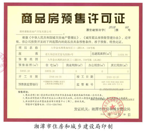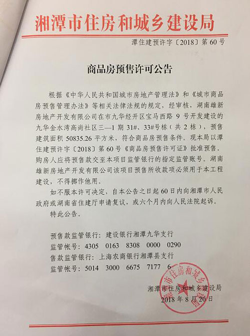 經(jīng)審核,湖南雄新房地產(chǎn)開發(fā)有限公司在市九華經(jīng)開區(qū)寶馬西路9號開發(fā)建設(shè)的九華金水灣高尚社區(qū)三—1期31#、33#號棟﹝共2棟﹞,預(yù)售建筑面積50835.26平方米,符合商品房預(yù)售條件,現(xiàn)湘潭市住建局以潭住建預(yù)許字(2018)第60號《商品房預(yù)售許可證》批準預(yù)售。 |
