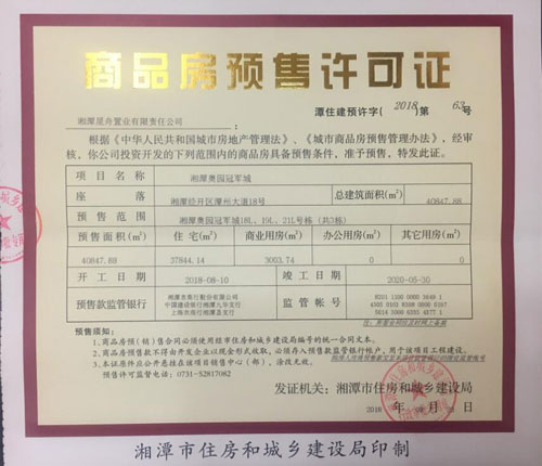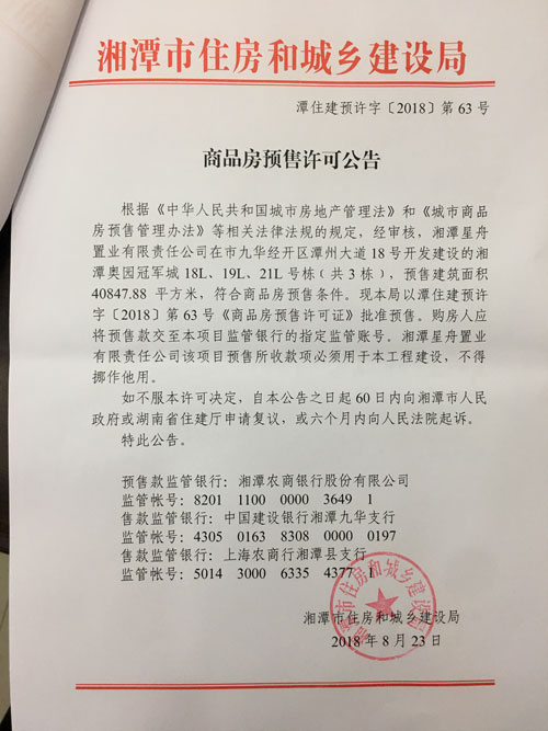 經(jīng)審核,湘潭星舟置業(yè)有限責(zé)任公司在市九華經(jīng)開區(qū)潭州大道18號(hào)開發(fā)建設(shè)的湘潭奧園冠軍城18L、19L、21L號(hào)棟﹝共3棟﹞,預(yù)售建筑面積40847.88平方米,符合商品房預(yù)售條件,現(xiàn)湘潭市住建局以潭住建預(yù)許字(2018)第63號(hào)《商品房預(yù)售許可證》批準(zhǔn)預(yù)售。 |