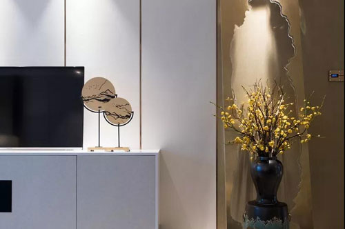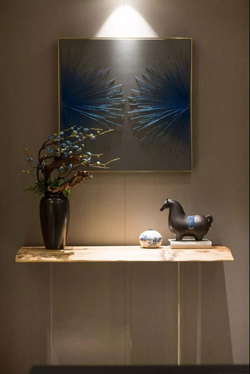 玄關(guān)設(shè)計(jì)以實(shí)木柜進(jìn)行隔斷,合理劃分并充分利用空間。桔黃的燈光搖曳收藏品之間,如置身博物館般,濃郁的人文氣息彌漫周圍。