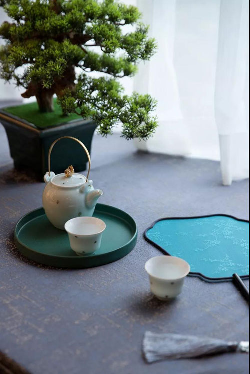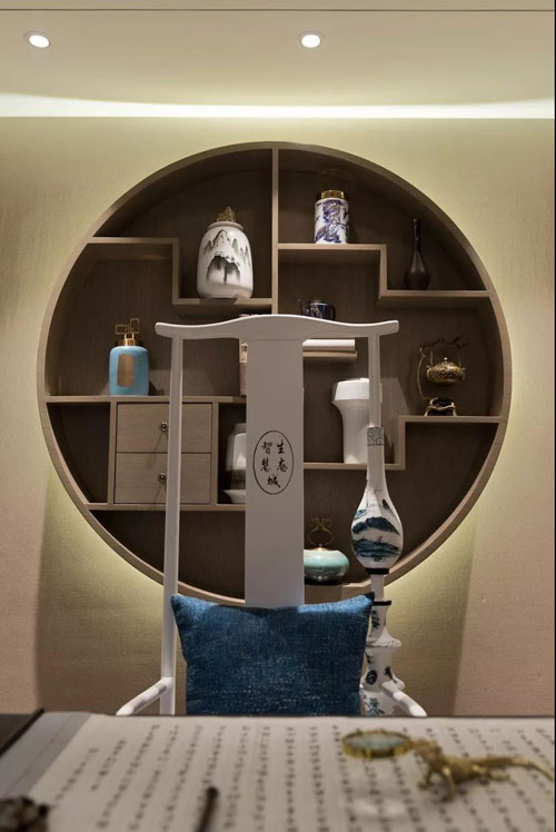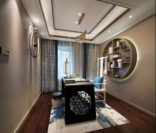 藍(lán)黑水墨渲染的地毯,給書房空間增添幾許靜謐的氛圍,于書卷文物中品味禪意和淡然。
