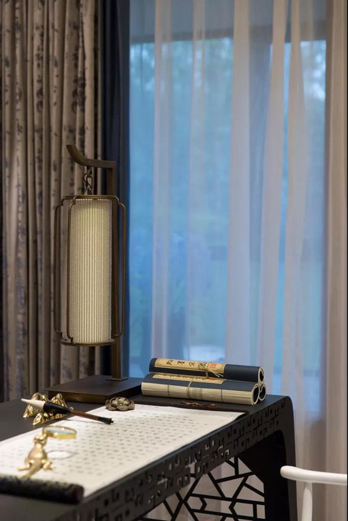 窗簾運(yùn)用傳統(tǒng)山水圖案掛簾,呼應(yīng)主題,作為室內(nèi)外空間的一個(gè)延伸。