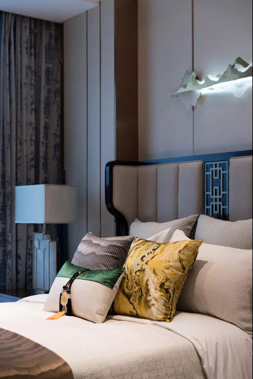 次臥的設(shè)計(jì)延續(xù)了主題風(fēng)格,“山”元素自然融入,人文的氣息愈發(fā)渾厚,光影之間營造出意境深遠(yuǎn)的空間氛圍,令人不自覺沉浸其中。