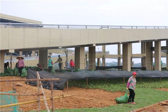 環(huán)形車道下面,工人正在進(jìn)行綠化種植