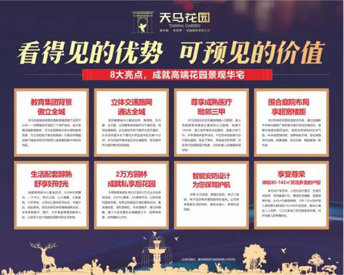 天馬花園,看得見的優(yōu)勢,可預(yù)見的價值!8大亮點,成就高端花園景觀華宅,建面約85-143㎡花園美宅,匠心品質(zhì),享入讀鳳凰初級中學(xué)優(yōu)先權(quán)。