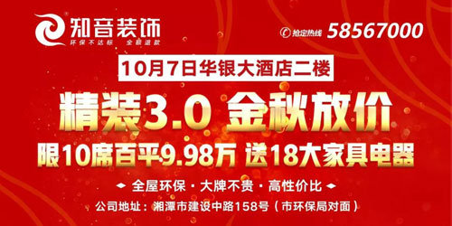 湘潭房產(chǎn)網(wǎng)10月7日訊    Hi,國慶節(jié)最后一天可別去湊熱鬧堵馬路啦。不妨來知音裝飾了解裝修,知音裝飾國慶金秋放價特大優(yōu)惠!全屋精裝3.0,100平只需9.98萬,送18大品牌家具電器哦!