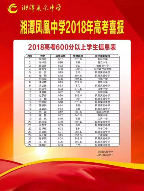 湘潭房產(chǎn)網(wǎng)10月9日訊 歲歲鳳凰花艷麗,今年猶勝去年時。歡呼聲里傳捷報,桃李林中綻芬芳。湘潭鳳凰中學(xué)在2018 年高考中,再創(chuàng)“低進高出,高進優(yōu)出”的佳績。