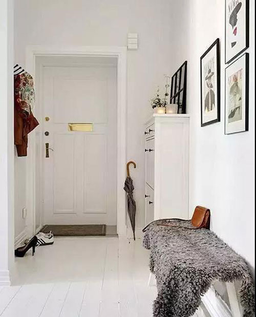 一進(jìn)門就是入戶玄關(guān),在玄關(guān)處打一柜方便存放鞋子、鑰匙、包包等,如果空間足夠還能存放一些其他生活物品。這樣玄關(guān)處就變得整潔了。
