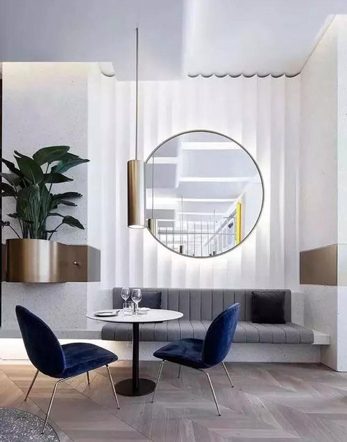 這兩種形式的卡座非常實(shí)用,因?yàn)樗鼈冏畲蠡乩每臻g,三面皆圍繞著桌子而布置,動(dòng)線明朗,空間緊湊,所以可以滿足多人入座、用餐的需求。