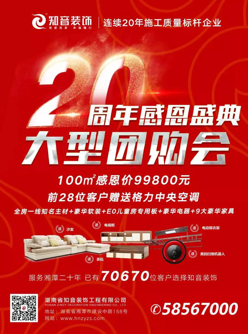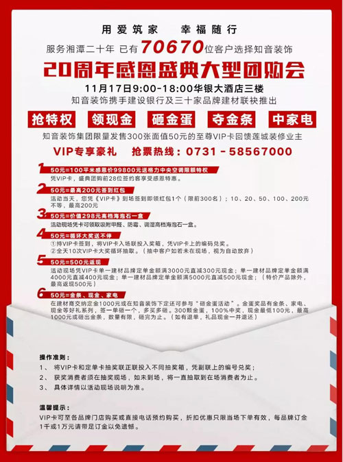 知音裝飾20周年慶感恩盛典大型團購會,驚爆首發(fā)!僅余28席,100平米感恩價99800元,活動優(yōu)惠最后一天,錯過再也沒有機會了。