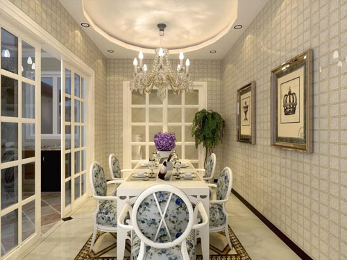 將餐廳區(qū)域和客廳區(qū)域采用不同的地面鋪貼方式,使空間分區(qū)干明確,將整個房間合理功能分區(qū)。