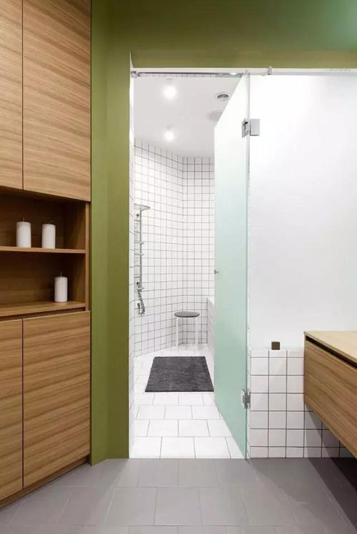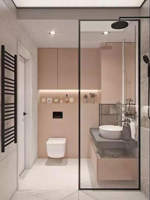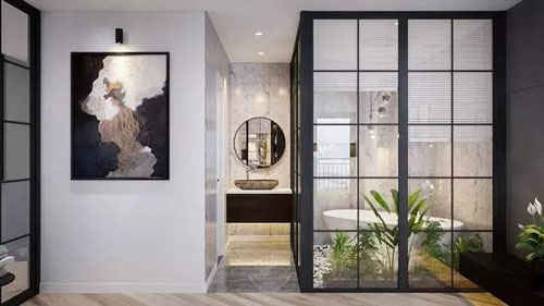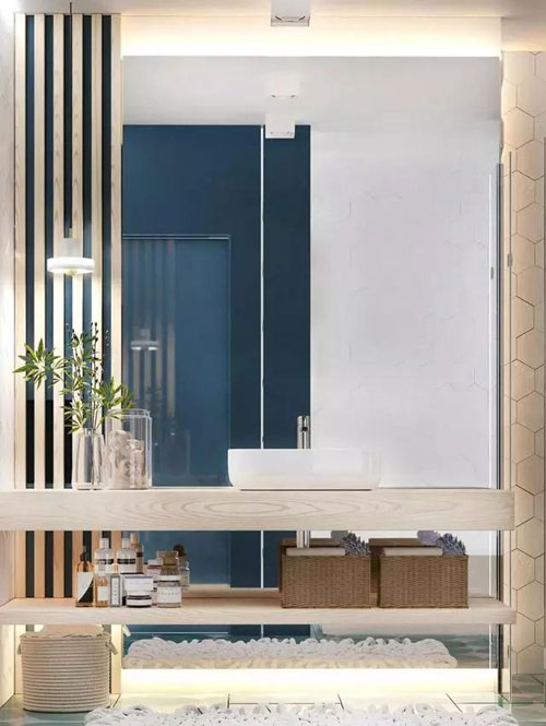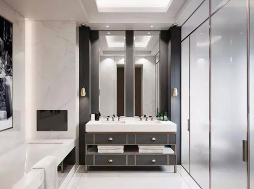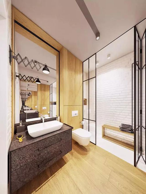 衛(wèi)生間加大鏡面范圍,可以補(bǔ)充光源;蛘咴阽R面背后安裝光源,會(huì)令空間顯得更明亮一些。衛(wèi)生間的門,最好使用透光的材料,比如大面積的磨砂玻璃等,可以增加室外光源的透光度。