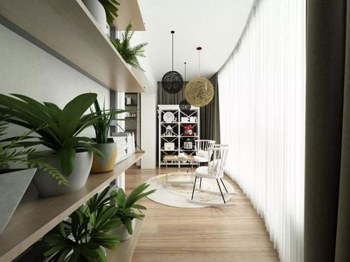 深綠色的窗簾可以在遮蔽陽光的同時與綠植遙相呼應,植物通過光合作用使室內(nèi)空氣更加新鮮!傍B歸巢、人思鄉(xiāng)”,鳥巢型的吊燈體現(xiàn)了主人的思鄉(xiāng)之情以及渴望在都市中尋求一份靜謐的渴望。