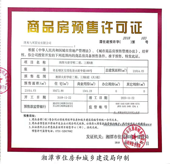 經審核,湖南九城置業(yè)有限公司在市岳塘區(qū)寶塔街道火炬中路168號開發(fā)建設的湘潭火炬學府二期、三期A座(共一棟)),預售建筑面積21014.03平方米,符合商品房預售條件,F湘潭市住建局以潭住建預許字(2018)第103號《商品房預售許可證》批準預售。