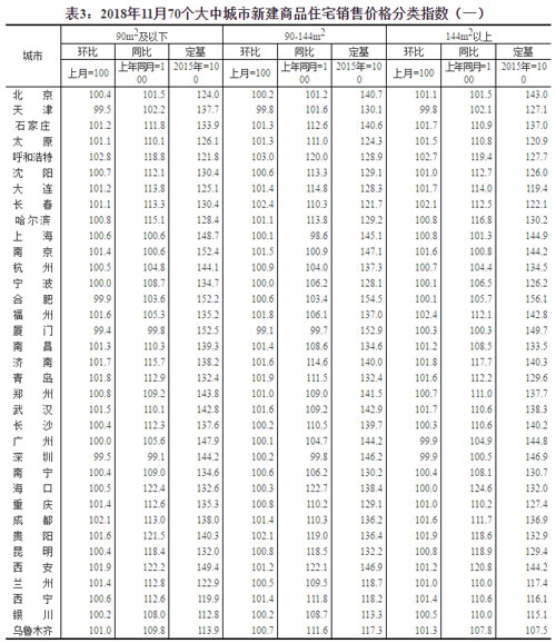 表3:2018年10月70個大中城市新建商品住宅銷售價格分類指數(shù)(一)
