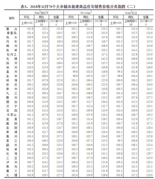 表3:2018年10月70個大中城市新建商品住宅銷售價格分類指數(shù)(二)