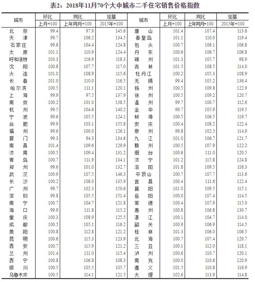 表2:2018年10月70個大中城市二手住宅銷售價格指數(shù)