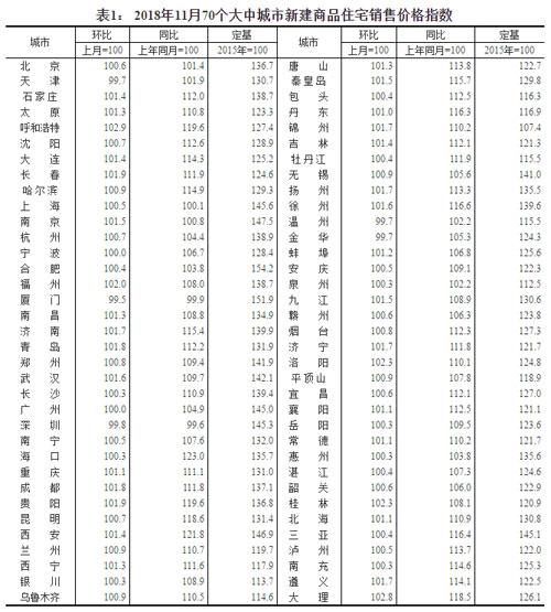 表1: 2018年10月70個大中城市新建商品住宅銷售價格指數(shù)