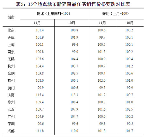 表5:15個熱點城市新建商品住宅銷售價格變動對比表