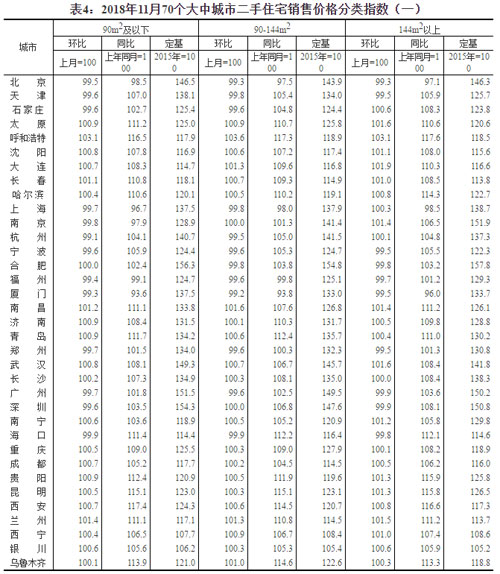 表4:2018年10月70個大中城市二手住宅銷售價格分類指數(shù)(一)