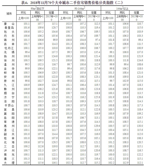 表4:2018年10月70個大中城市二手住宅銷售價格分類指數(shù)(二)