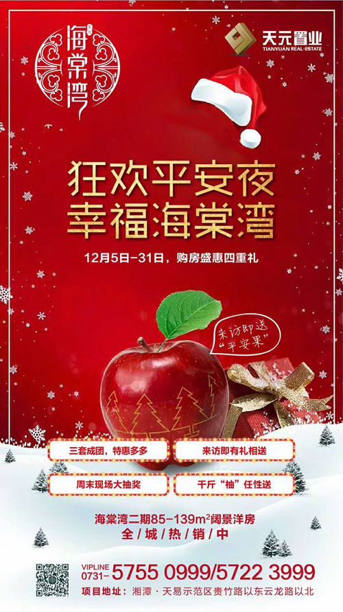 湘潭房產(chǎn)網(wǎng)12月24日訊 平安夜是一個(gè)世界性的節(jié)日,特指12月24日全天,傳統(tǒng)上是擺上圣誕樹的日子,大多數(shù)的歐美家庭成員都會(huì)選擇在這天團(tuán)聚,共進(jìn)豐盛的晚餐,然后圍坐在一起,共敘天倫之樂,通宵達(dá)旦地慶祝。