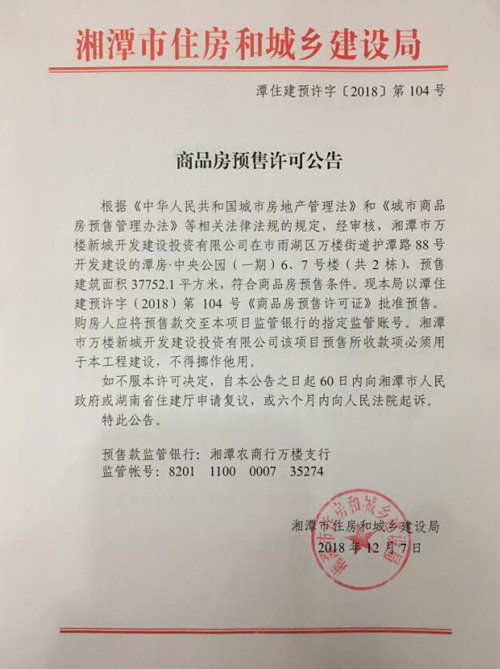 經(jīng)審核,湘潭市萬樓新城開發(fā)建設(shè)投資有限公司在市雨湖區(qū)萬樓街道護(hù)潭路88號開發(fā)建設(shè)的潭房·中央公園(一期)6、7號樓(共2棟),預(yù)售建筑面積37752.1平方米,符合商品房預(yù)售條件。現(xiàn)湘潭市住建局以潭住建預(yù)許字(2018)第104號《商品房預(yù)售許可證》批準(zhǔn)預(yù)售。 |