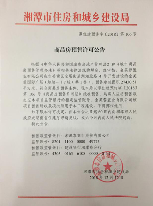 經(jīng)審核,金芙蓉置業(yè)有限公司在市岳塘區(qū)寶塔街道湖湘北路4號開發(fā)建設(shè)的金芙蓉國際廣場(地塊一)7棟(共1棟),預(yù)售建筑面積27430.51平方米,符合商品房預(yù)售條件。現(xiàn)湘潭市住建局以潭住建預(yù)許字(2018)第106號《商品房預(yù)售許可證》批準(zhǔn)預(yù)售。 |